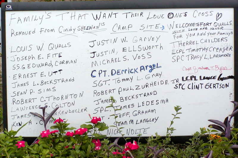 In front of Ft. Qualls stands an updated dry-erase board that shows that other families are also tired of the usage of the memories of their fallen loved ones by the Sheehan cross-planting camp.