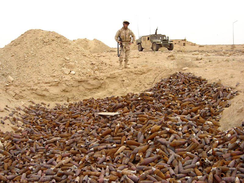 Sgt. William J. Hartman [sic] of the 3rd Battalion, 112th Armored Regiment, 56th Brigade Combat Team, 36th Infantry Division, stand [sic] watch over a pit full of Iraqi mortar rounds waiting to be destroyed by a civilian explosive ordnance disposal team at the Akudar Ammunition Depot located in central Iraq.
